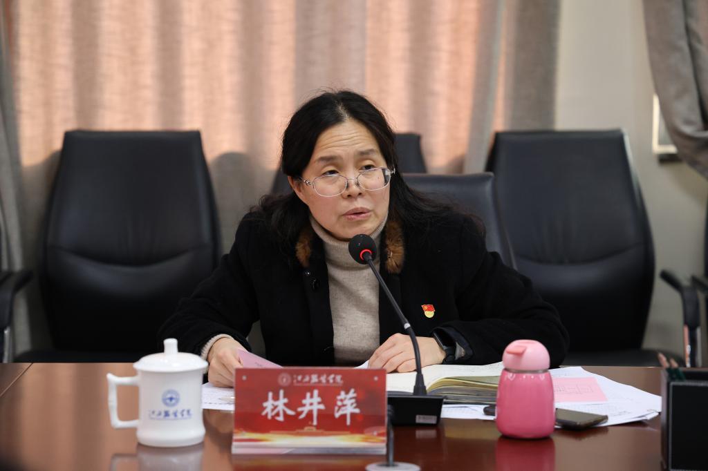 林井萍在总结讲话中对刘芝平部长全方位且十分客观的点评表示衷心的感谢。林井萍强调,全校上下要认真学习习近平考察江西重要讲话精神,深刻领会习近平文化思想的核心要义、精神实质、丰富内涵和实践要求,认真读原著、学原文、悟原理,自觉用习近平文化思想指导解决实际问题。林井萍就推进学校高质量发展提出意见:一是要感悟思想伟力,凝聚奋进力量。全校上下要持之以恒学习贯彻习近平总书记考察江西重要讲话精神,学好用好《习近平文化思想学习纲要》,在“两个结合”中推动学习贯彻习近平总书记重要讲话精神、习近平文化思想走深走实。坚持学思用贯通、知信行统一,增强干的动力,形成干的合力,在以学促干上取得实实在在的成效。二是强化政治引领,踔厉奋发开拓新局。全校上下要提高政治站位,把学习贯彻习近平总书记考察江西重要讲话精神与习近平总书记关于党的建设的重要思想和全国高校党的建设工作会议精神结合起来,要推动习近平文化思想进教材、进课堂、进头脑,构建“大思政课”格局,把正确的政治方向、价值导向贯穿办学治校、教书育人全过程各方面,确保学校始终沿着社会主义办学方向前进。三是要锚定办学目标,推动高质量发展。要将学习贯彻习近平总书记考察江西重要讲话精神与持续深化教育教学改革结合起来,与完成年度目标任务结合起来,把中华优秀传统文化、革命文化和社会主义先进文化融入大学文化建设,发挥校园新媒体矩阵融合传播、协同发声效应,着力讲好新时代江服故事,把理论学习成果转化为推动工作的实际成效,全力以赴加快推进学校高质量发展,以更加昂扬的姿态奋力谱写新时代学校教育发展的新篇章。