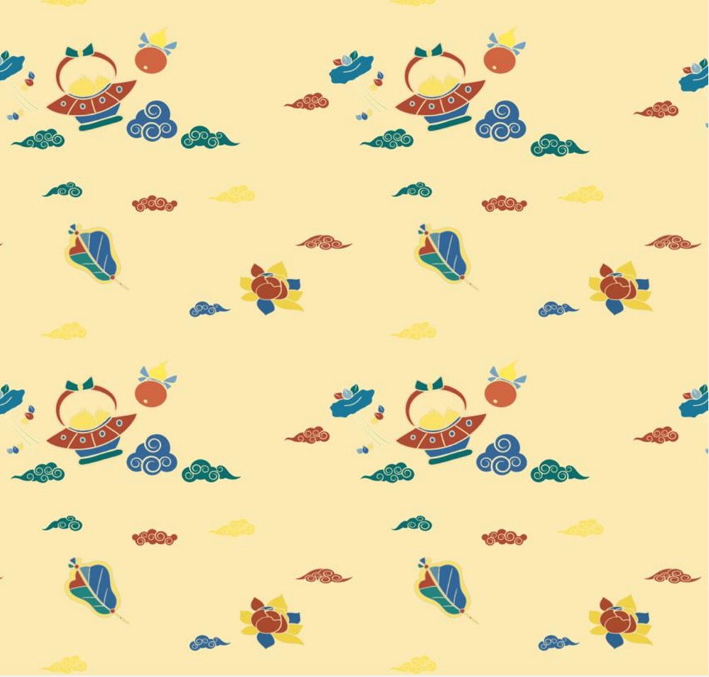 此作品攫取八仙法器中的祥云、葫芦、花篮、芭蕉扇、桃子等元素进行再设计,融合天、水、山的意境,结合阴阳协调的理念,体现了中华传统文化的包罗万象。用红、蓝、绿、黄几种饱和度高又富有传统意味的色彩大胆碰撞,画面如晴空万里,明朗清晰,传达一种活泼向上的生命力。