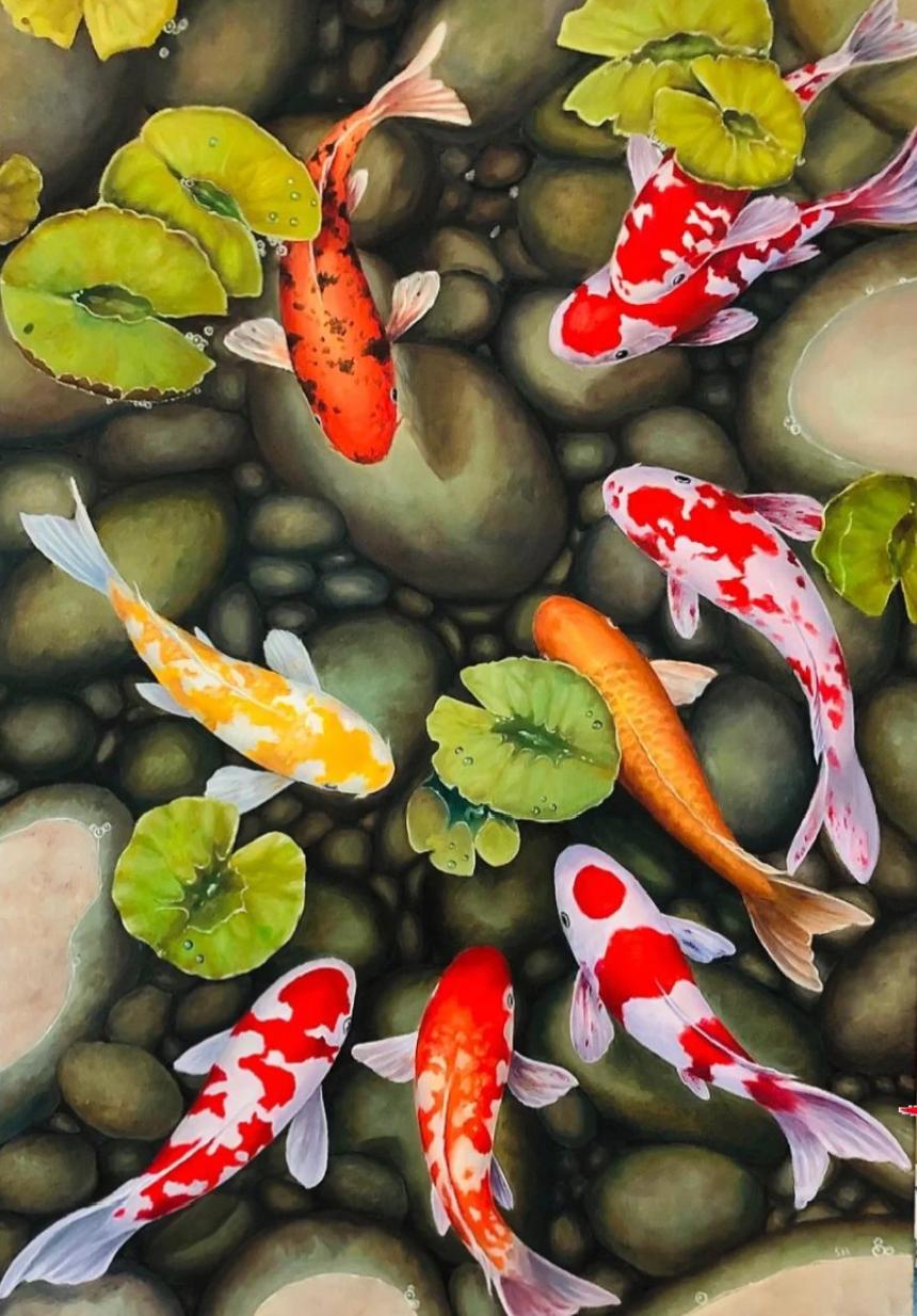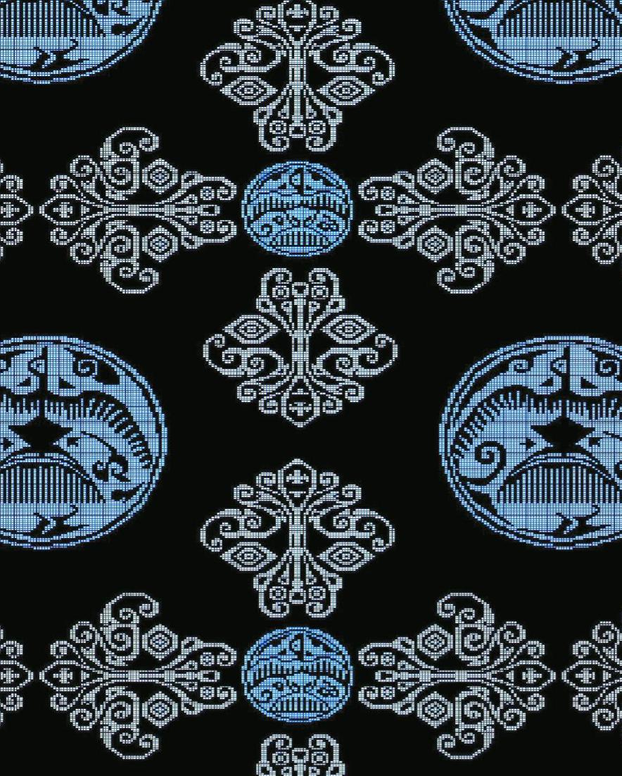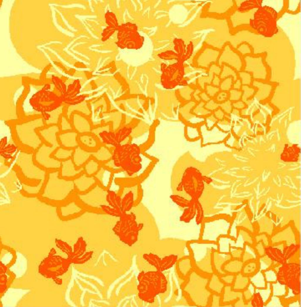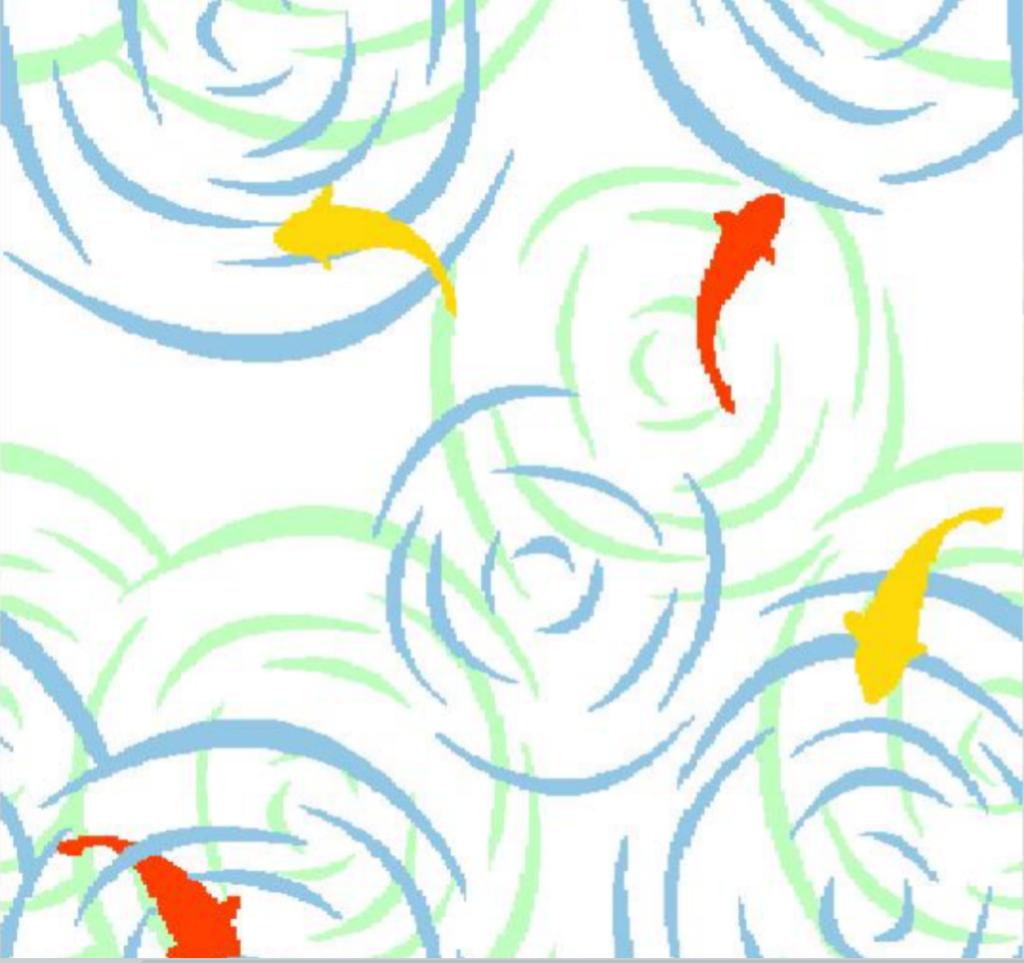 灵感来源于水中游动的锦鲤,在嬉戏中带起水波。为了表现锦鲤和水的层次空间关系,浅色水纹作底纹,部分锦鲤跃动于深色水纹之上,部分锦鲤潜藏于水纹之下。采用唐锦工艺,既显现了层次分明的底纹,又体现了锦鲤的立体造型。