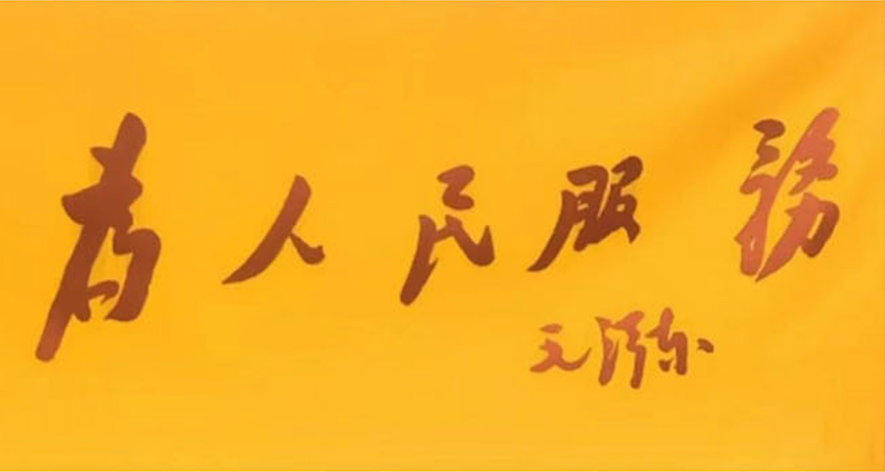 采用云锦妆花工艺,以金色丝为经线、红色丝为纬线织造而成。內幅宽76cm,外幅宽78cm,长1.56m。纹样来源于毛泽东主席亲笔题写的中国共产党的宗旨:“为人民服务”,纪念党的诞辰100周年。