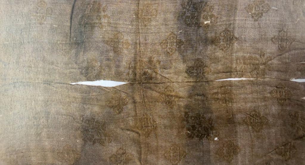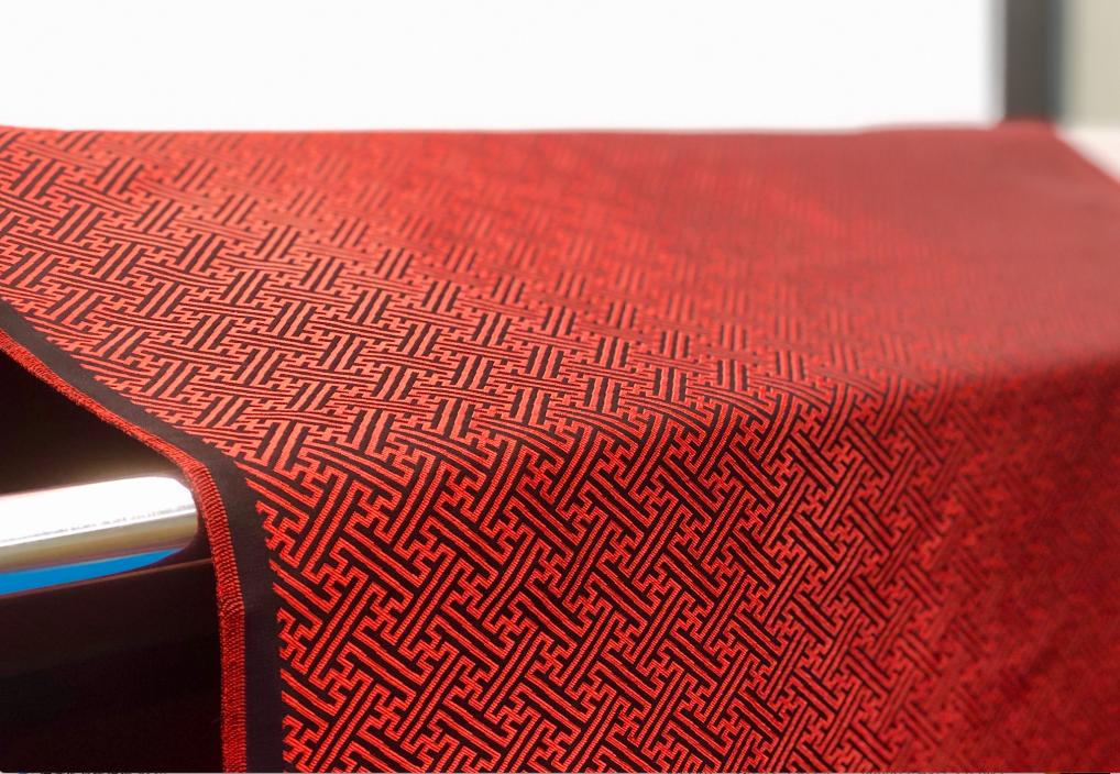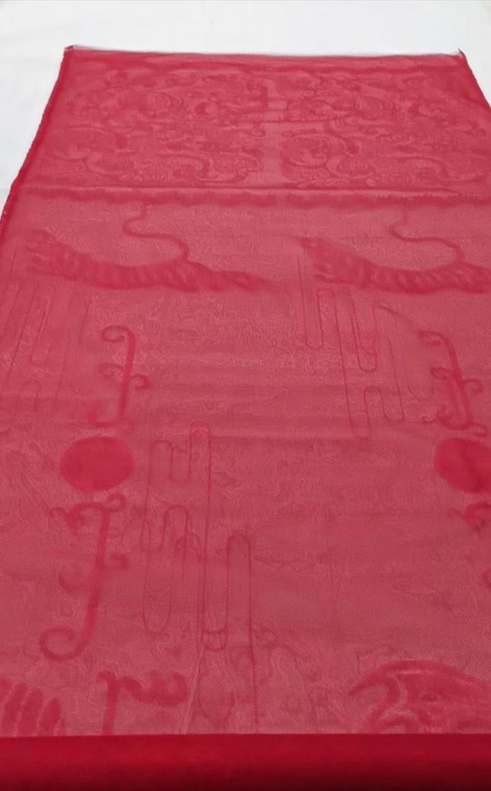 采用宋锦工艺,以红丝为经线、金银丝为纬线织造而成。內幅宽70cm,外幅宽72cm,长2m。万字纹有一个别称叫“万字不到头”,多个万(卍)字连接在一起,形成一种四方连续的图案。在古代主要作为皇家御用图案,寓意连绵不断、万寿无疆等含义。