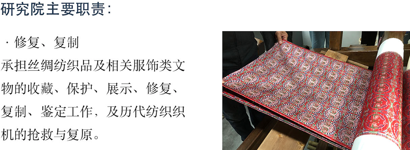 古丝绸织绣技艺研究院是江西服装学院设立的非物质文化遗产保护的专门机构,致力于丝绸织绣技艺的传承与创新。本次展品为研究院用古织机织造的丝织品,其中“传承·保护”展示了唐锦、宋锦、云锦等复制丝织品,“创新·设计”主要展示了服装工程学院19级纺织项目班的织物设计作品。