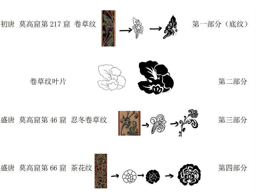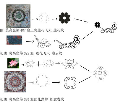 灵感来源于古代的落花流水纹,展现一幅凋零的花被流水带走的景象,有着别样的美感。莲花纹的再设计糅合了敦煌壁画中唐代莲花纹与现实中的莲花造型。敦煌壁画中唐代出现的莲花纹多带有宗教色彩,少许柔美,因此与生活中的莲花植物形态结合,将莲花线条的柔美融入其中。卷云纹的线条曼妙生动,若流水般流连不息,增强了整体纹样的柔和气息。