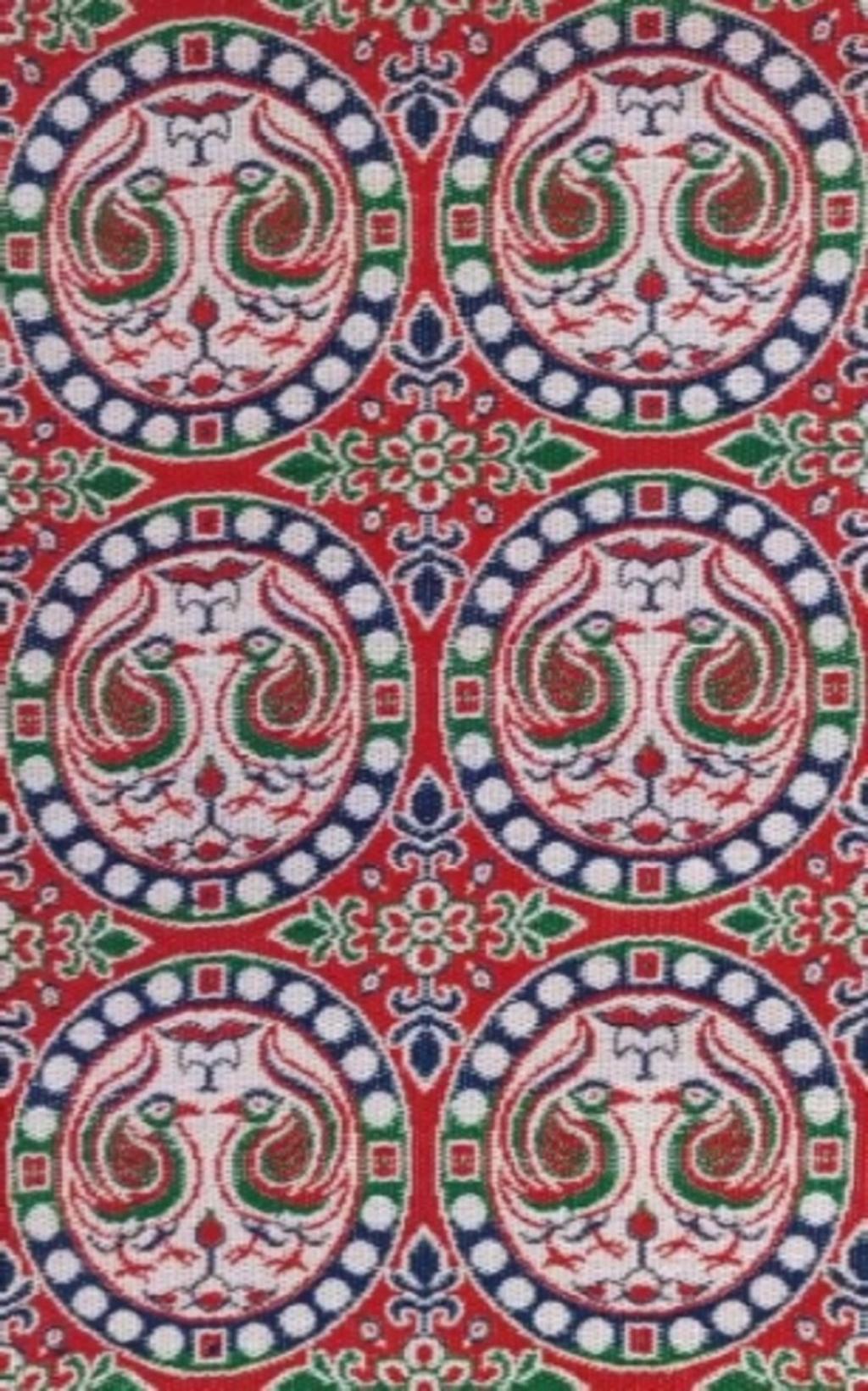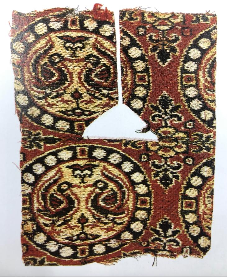 采用唐锦工艺,红色丝为经线,蓝色、白色、绿色丝为纬线织造而成。內幅宽48cm,外幅宽49cm,长3.6m。纹样来源于新疆乌鲁木齐博物馆绢衣彩绘木俑上的披肩服饰图案。外环的联珠环以5个联珠为一组,共4组,由回字形方块间隔。窠内主题纹样为两两相对的立鸟,鸟的上方与下方均有一植物纹,联珠环之间的辅花为十字形花叶纹。