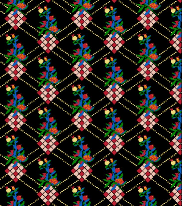 灵感来源于生活中富有朝气的植物。此作品取敦煌的传统植物纹进行再设计,呈现其欣欣向荣的面貌。敦煌莫高窟中的植物纹形态优美,保留了传统敦煌植物纹的柔美,并运用多样交替的色彩显现出图案的层次,突出了植物的灵动和缠绕感。整体纹样排列如植物向上延伸,传递一种生机勃勃的生命力量。