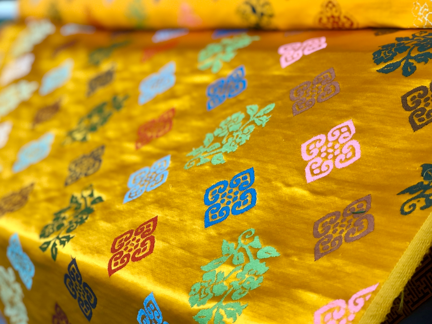 采用云锦妆花工艺,以多色丝为经线,金色丝为纬线织造而成。內幅宽76.5cm,外幅宽78.5cm,长3.8m。纹样来源于江西德安南宋周氏墓丝织品,山茶花卉为横斜带叶花枝,与四合如意纹搭配,造型优美,生动灵秀。