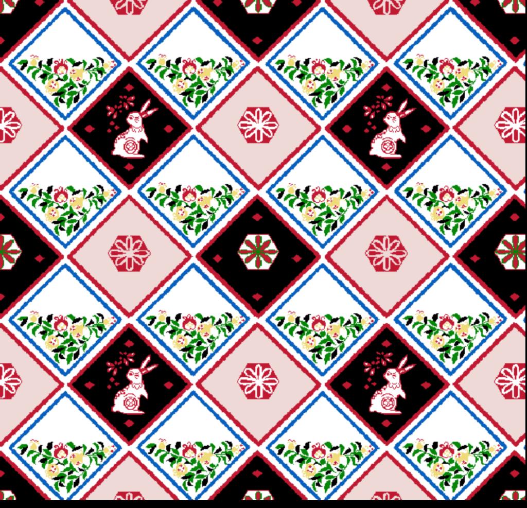 此作品延续上一个系列,精致的石榴花配以藤蔓型的石榴枝、兔子等元素,着重于藤蔓型石榴枝的再设计,以跳跃的兔子形象串联,给人活泼、喜悦之感,充满生命力。