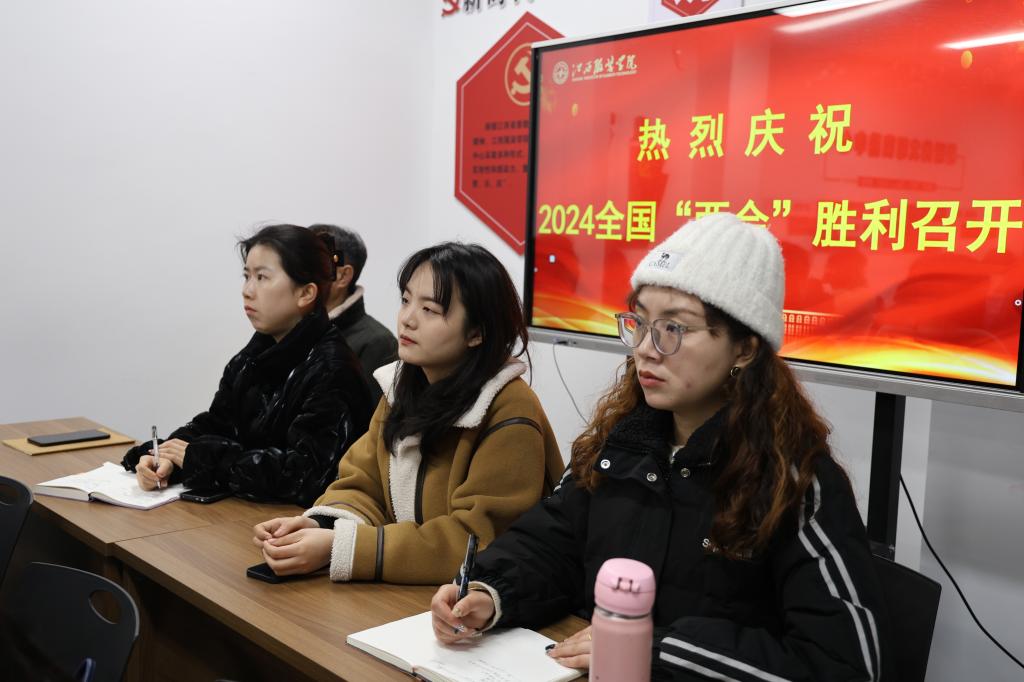 新闻中心讯(文/万强 樊翔 图/万强)全国政协十四届二次会议、十四届全国人大二次会议分别于3月4日、3月5日在北京开幕。江西服装学院师生热切关注全国两会盛况,校党委书记陈付龙,党委副书记、副校长李宝君,校长助理马国照等校领导和部分师生代表70余人在党委宣传部新时代文明实践中心集中收看了两会直播。同时,各学院、各部门分别安排分会场组织师生收看了大会盛况。大家一致表示,对2023年经济社会发展取得的成就倍感振奋,对未来国家发展充满信心,要以实际行动贯彻落实两会精神,努力建设高质量教育体系。