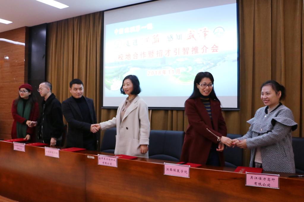 现场进行了盛泽云纺城驻江西服装学院流行面料O2O展示基地揭牌、校企合作项目的集中签约仪式。盛泽东方城、佳力高纤、前衍时装等相关企业与我校进行了签约,为我校与盛泽进一步深化校地合作开启了新的篇章。
