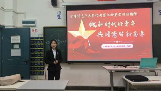新闻中心讯(文字/吴名 图片/汪玉涵 崔佳瑶 高仪 陈睿琦 刘丽娟) “希望大家能从此次的宣讲中有所收获。”话音刚落,教室内响起热烈掌声。宣讲员王燕讲完课件后深深鞠躬,胸前的宣讲团团徽在灯光映照下熠熠生辉。2023年11月12日晚,为深入学习贯彻习近平总书记在江西考察时的重要讲话精神,充分认识习近平总书记考察江西的重大意义,江西服装学院大学生旗帜宣讲团走进班级开展“强国复兴有我、青年勇担当,学习贯彻习近平总书记考察江西重要讲话精神”巡回宣讲活动。