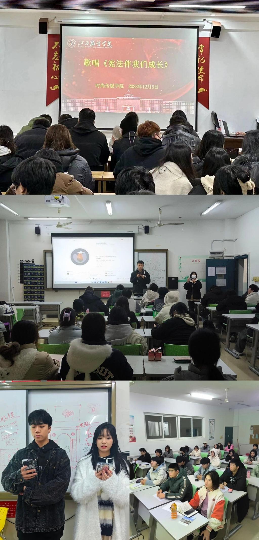 宪法宣传周期间,时尚传媒学院、艺术设计学院分别开展了《宪法伴我们成长》的歌曲传唱活动。在活动中,同学们一起跟随着学长学姐学习歌曲《宪法伴我们成长》,并通过各种形式进行传唱。每位同学都积极参与,用心去感受宪法的力量,用歌声传递着同学们对宪法的热爱和尊重。