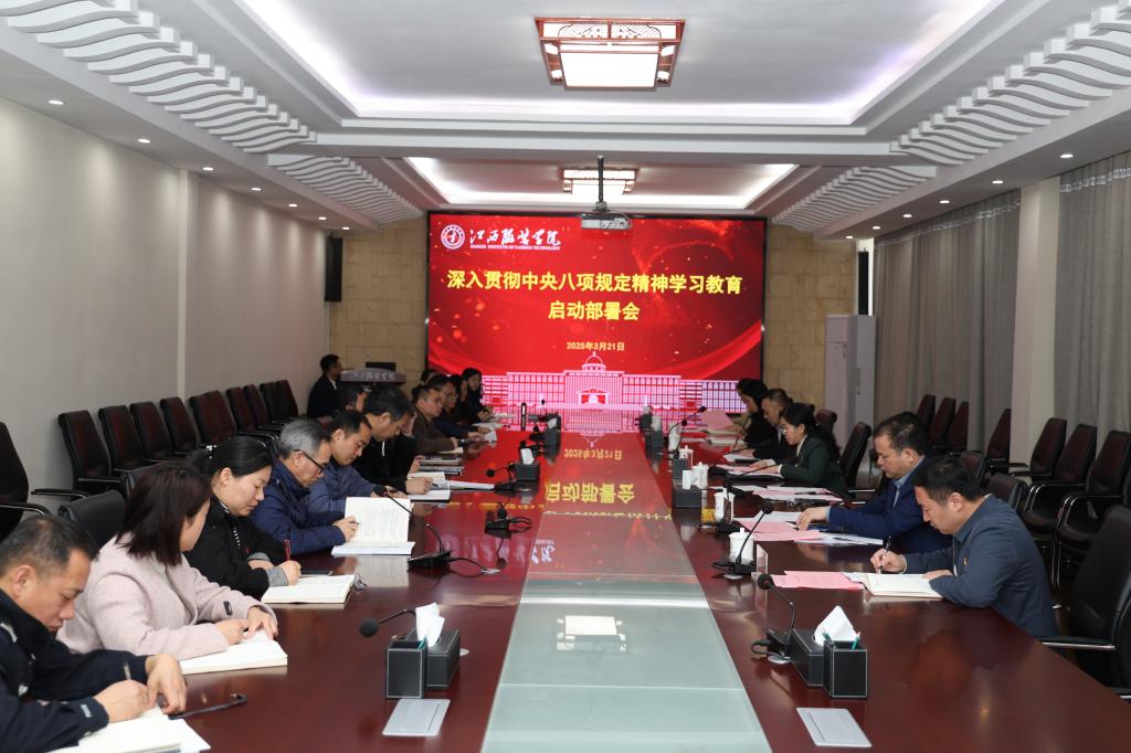 会上,传达学习了习近平总书记关于深入贯彻中央八项规定精神学习教育的重要讲话和重要指示精神以及党中央、省委关于开展深入贯彻中央八项规定精神学习教育的有关文件和会议精神,全面启动部署学校开展深入贯彻中央八项规定精神学习教育工作。