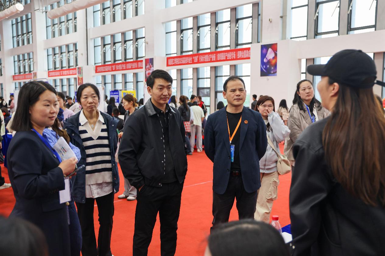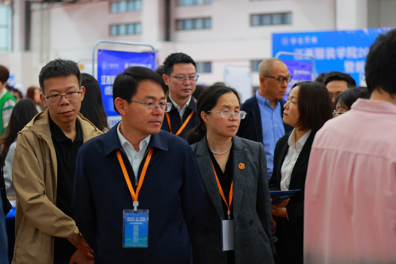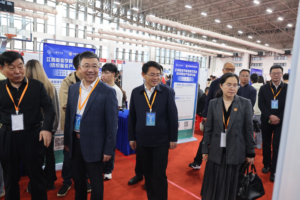4月27日上午,江西省2025届高校毕业生“1269”行动计划重点产业链系列招聘会(纺织服装产业链专场)暨江西服装学院2025届毕业生春季双选会在江西服装学院室内体育馆举行。本次双选会由江西省教育厅主办,江西省工业和信息化厅指导,江西省教育评估监测研究院、江西服装学院共同承办。学校党委书记林井萍、校长薛家宝、分管校领导唐新强,江西省教育评估监测研究院干部吴小湖、罗菁,南昌县委常委组织部长邬春华等领导深入现场指导。