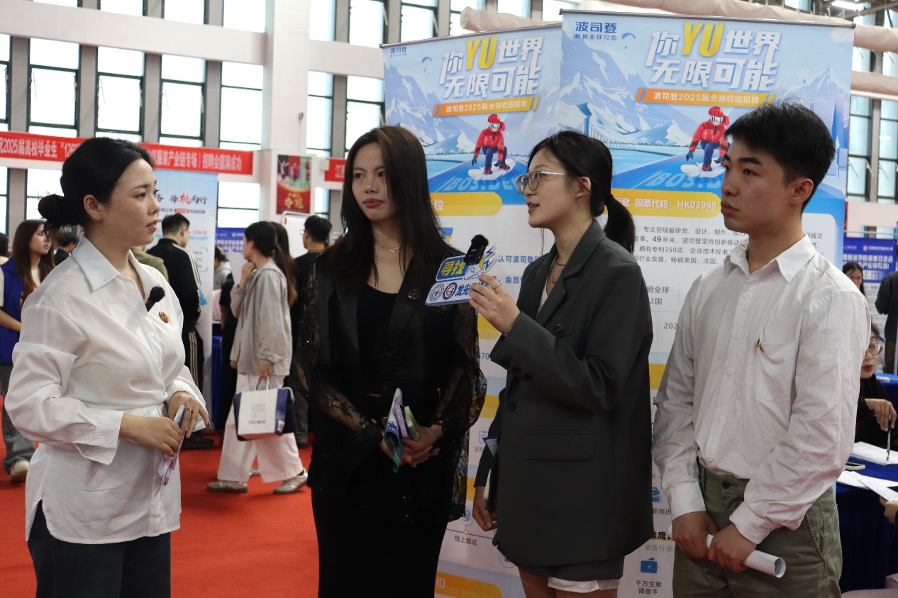 服装设计学院郭湛同学在波司登展位前表示:“在波司登产业学院的学习经历,让自己不仅对企业有了更深的了解,也能更好地对接市场需求。”商学院22电商本科2班吴楠同学说,“通过与企业HR的深度交流,我不仅了解到行业前沿动态,更明确了职业发展方向。”
