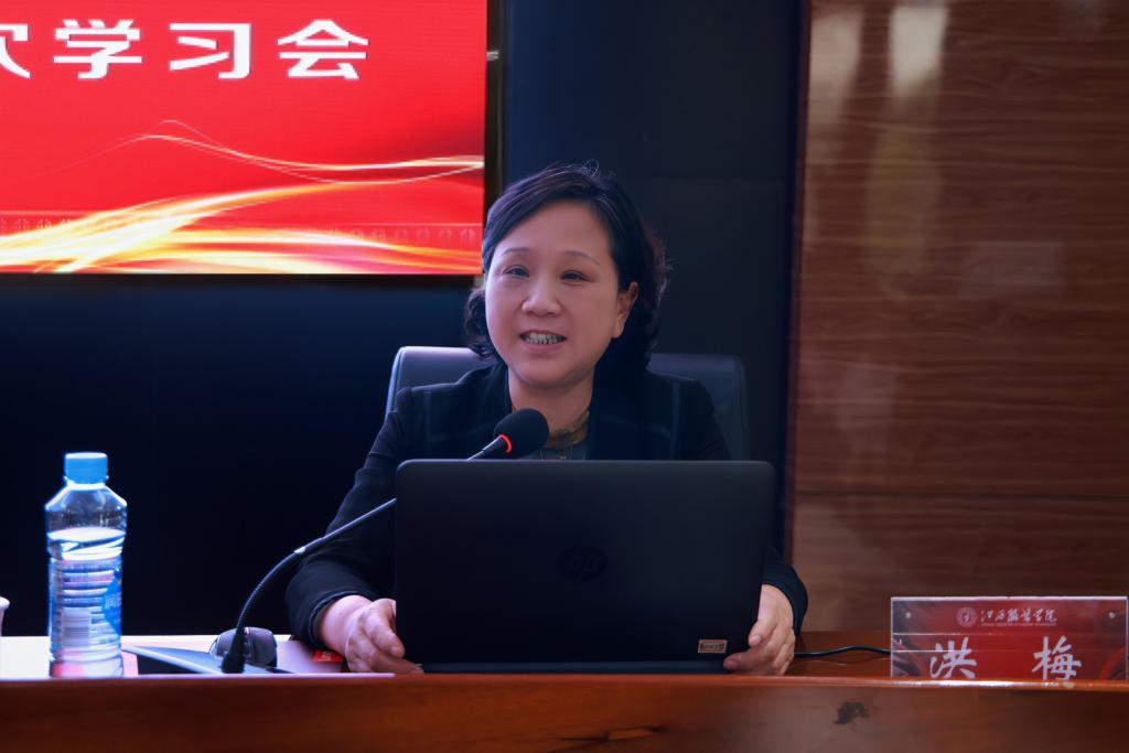 新闻中心讯(文/龙瑞行 图/万强)4月30日上午,江西服装学院党委理论学习中心组(扩大)第五次学习会在行政楼一楼报告厅召开。本次会议特邀省纪委监委驻南昌航空大学纪检监察组组长、南昌航空大学党委常委、纪委书记洪梅作题为《民办高校全面从严治党的实践与思考》专题辅导报告。校党委书记林井萍主持会议并讲话,校党政领导班子成员、全体中层以上干部、专兼职党务工作者参加会议。