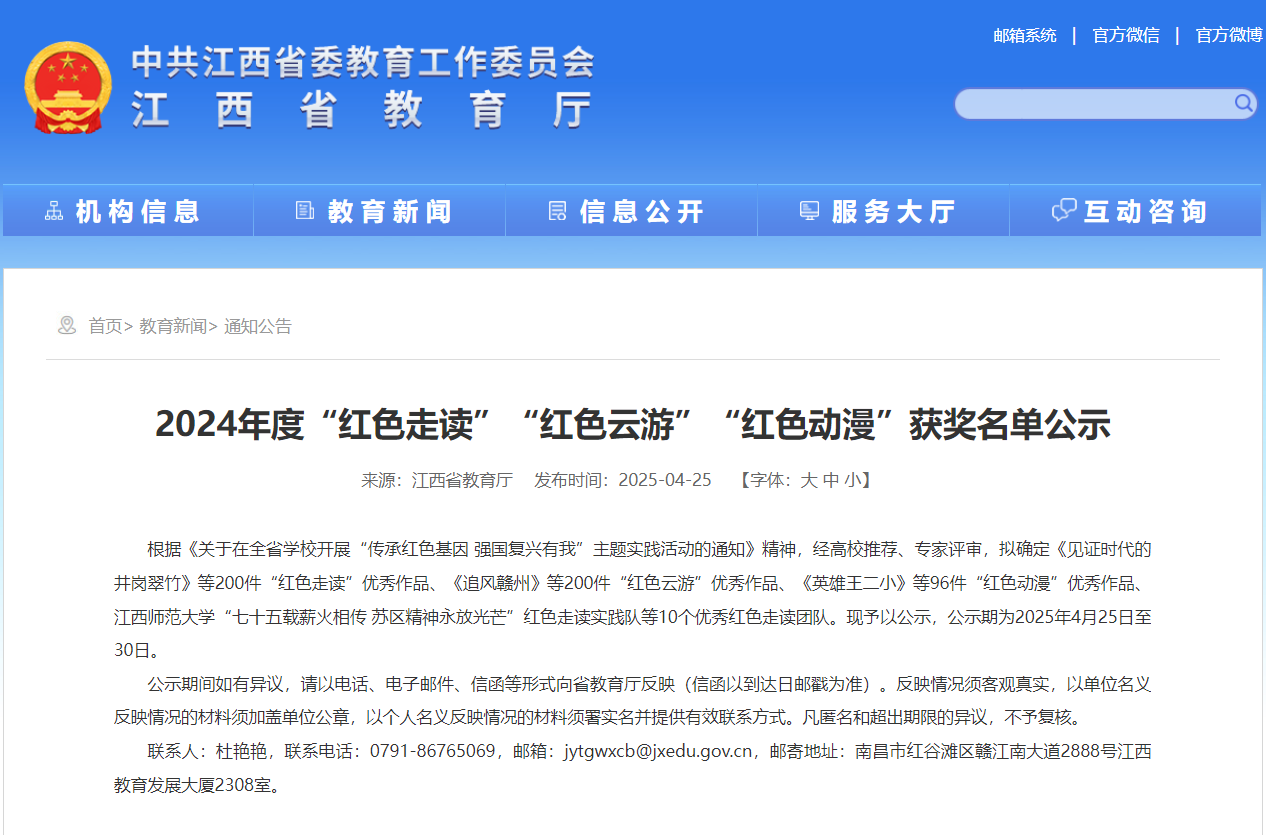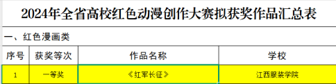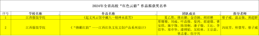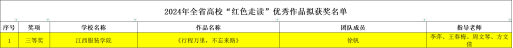 新闻中心讯(文/龙瑞行)4月25日,江西省教育厅公布了2024年度“红色走读”“红色云游”“红色动漫”拟获奖名单,我校共获6项奖项,其中“红色走读”优秀作品三等奖1项、“红色云游”作品获奖2项、红色动漫创作大赛获一等奖1项、三等奖2项,获奖数量居全省民办本科高校前列,彰显了学校在红色文化传承与教育实践方面的突出成果。