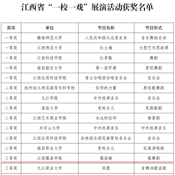 新闻中心讯 1月12日,江西省教育厅公布江西省“一校一戏”展演活动获奖名单。我校歌舞剧《服装赋》荣获三等奖。