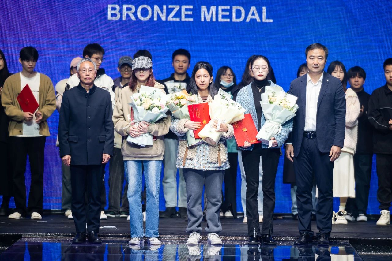 江西服装学院副校长刘孜杰、中国纺织教育学会副会长纪晓峰为铜奖获得者谢梨萍、李彩瑶、邱文洁颁奖