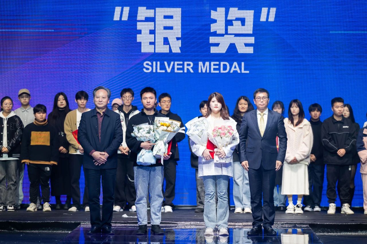江西服装学院副校长陈东生、中国服装设计师协会专职副主席谢方明为银奖获得者张新顺、刘真真颁奖