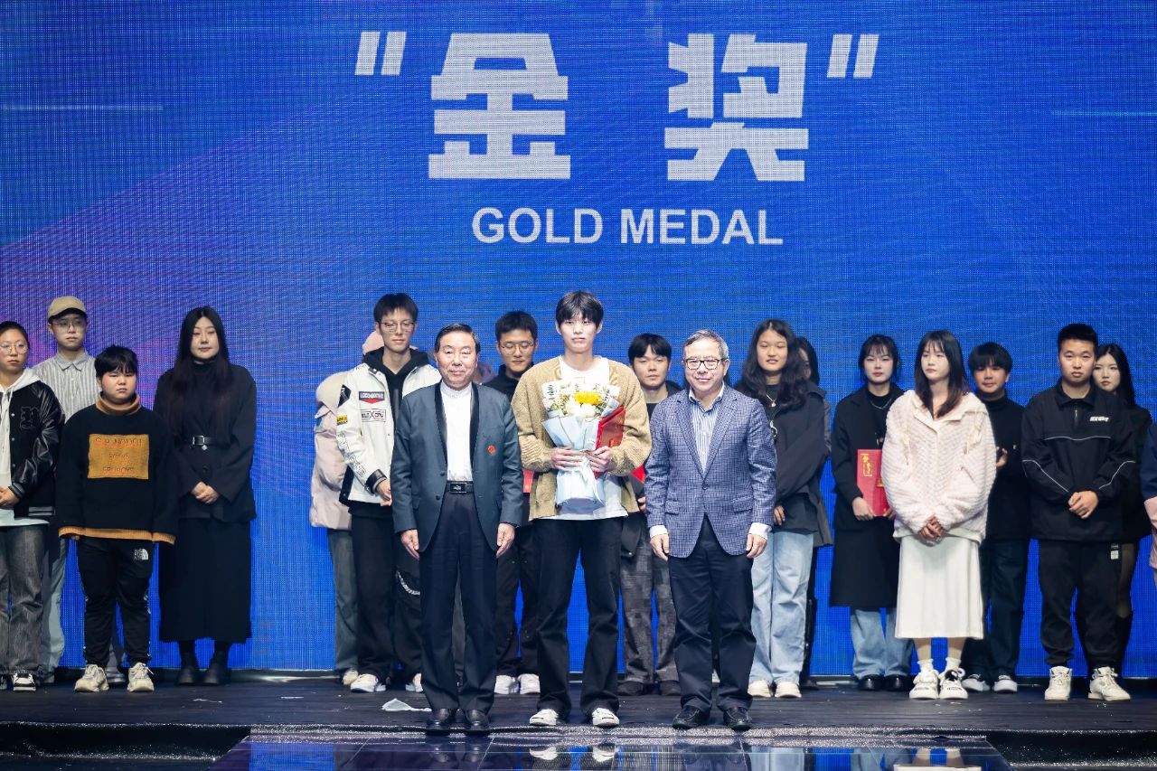 江西服装学院校长薛家宝、中国纺织服装教育学会会长倪阳生为金奖获得者闵龙辉、王哲文颁奖