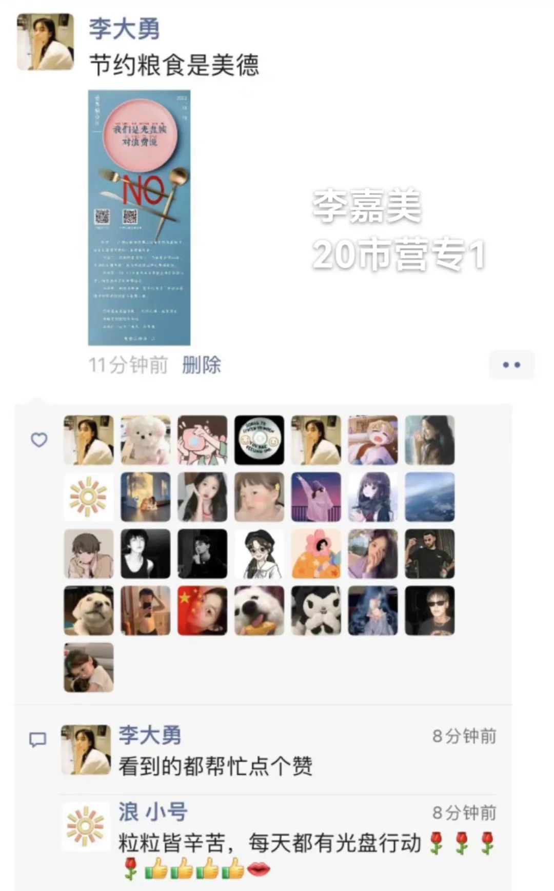 据悉,本次活动将持续开展一周时间,接下来,学院还将开展世界粮食日和全国粮食安全宣传周线上宣讲活动、节粮爱粮知识答题等系列粮食安全宣传活动,强化师生粮食安全意识,让节约理念潜移默化而又深远持久的成为广大师生的行为准则。用实际行动参与到节约粮食的行动中来,形成“浪费可耻、节约为荣”的文明校园新风尚。