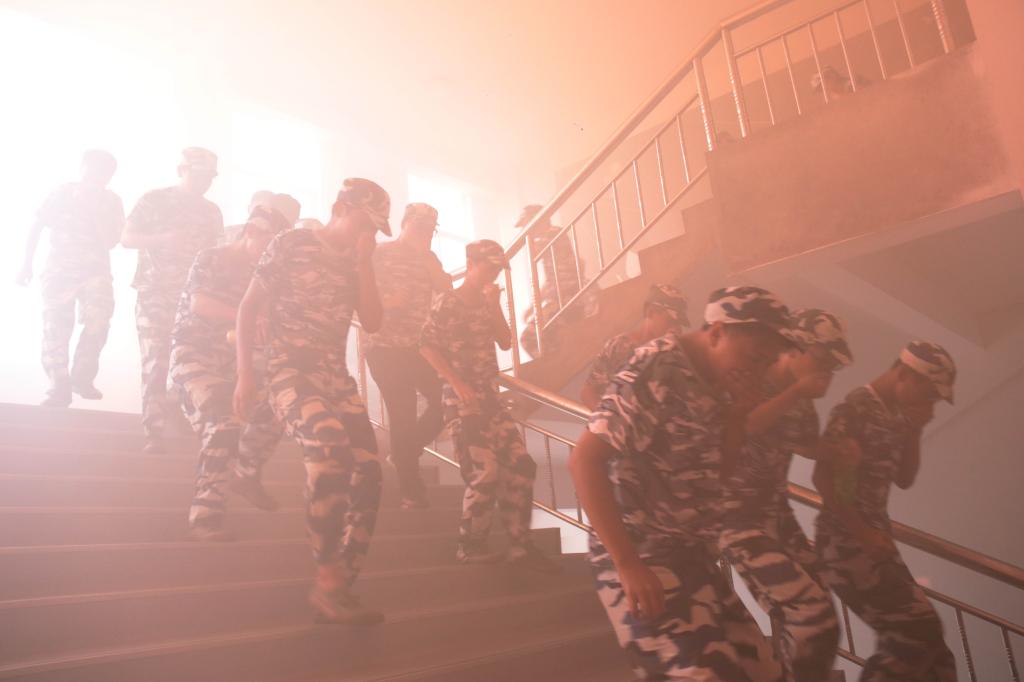 演练开始后,主教学楼外警报鸣响,楼内浓烟滚滚、烟雾弥漫,同学们迅速使用口罩、帽子、衣袖等物品捂住口鼻,在教官和老师的引领下,猫着腰有序地前行,穿过走廊,通过楼梯,快速下楼。在整个疏散过程中师生配合默契、疏散路线清楚、组织有条不紊。