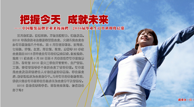 记者获悉,2016届毕业生订单班招聘工作将于5月6日正式拉开序幕。截止4月25日,学校校企合作办选定了浙江乔顿服饰有限公司、东蒙集团有限公司、波司登集团、江苏红豆实业股份有限公司、利郞(中国)有限公司、江苏阿仕顿服饰有限公司、浙江绿迪服饰等12家公司来校开设订单班,为同学们提供了设计、工艺、营销、生产管理、品质管理、跟单等800多个岗位,近期,这些企业将陆续来校举行订单班招聘宣讲会。