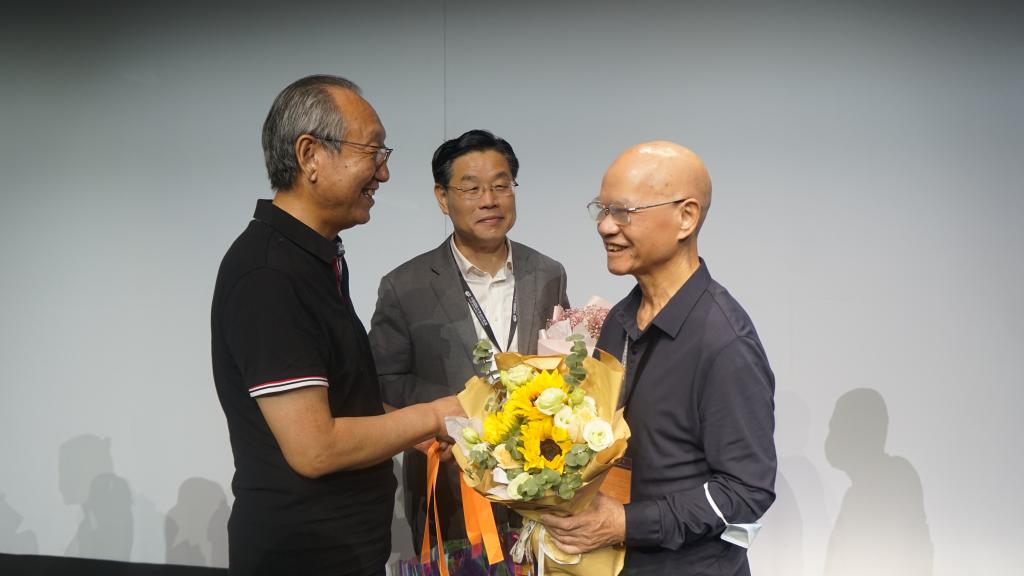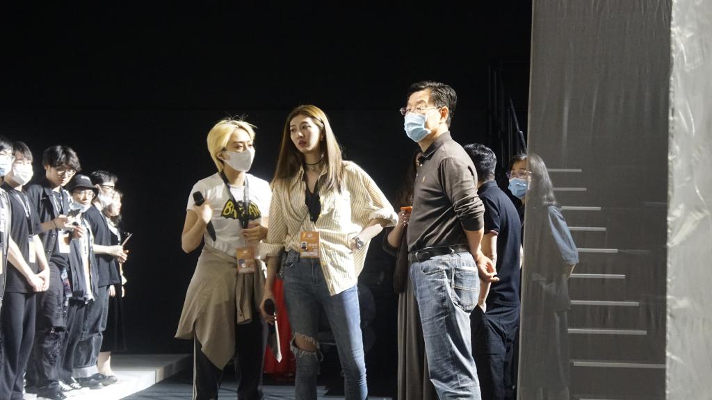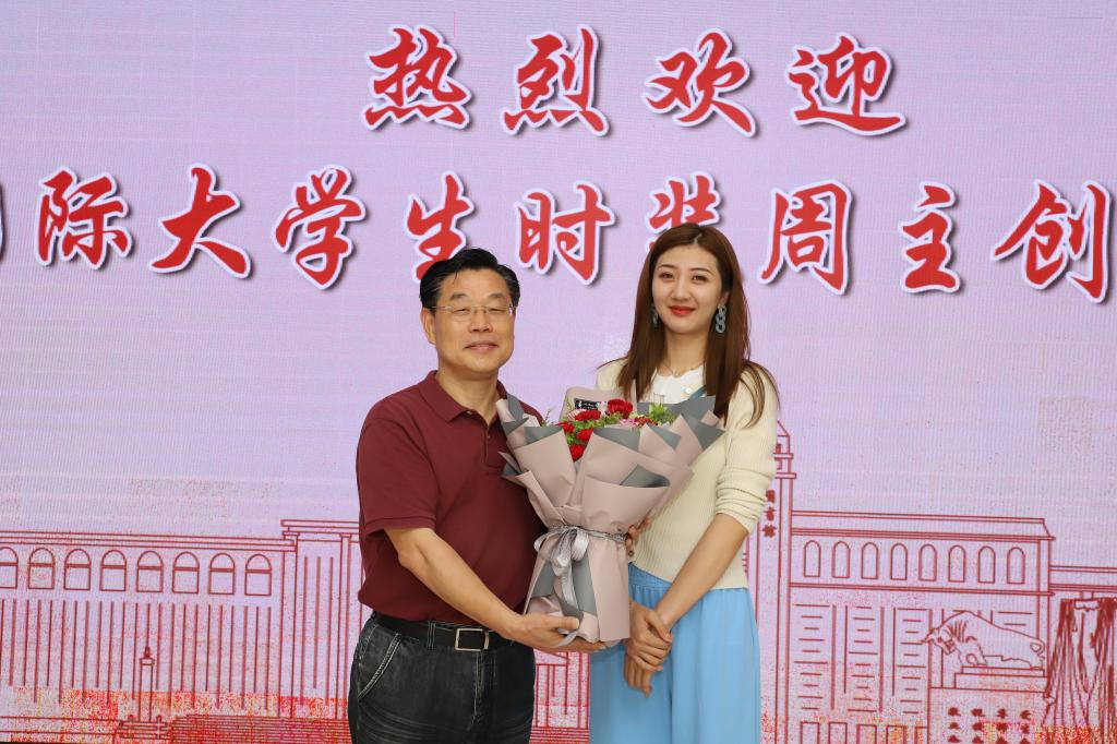 在接见现场,时装周的展演主创团队代表向徐炜副校长献了花,感谢徐炜副校长与参演、参赛团队一起齐心协力、努力拼搏,经历各种挑战,还利用各种假期组织、邀请相关专家对参赛选手进行培训、指导,并特别感谢八年来一如既往对中国国际大学生时装周工作的组织和指导。
