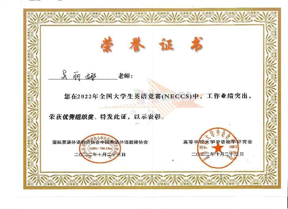 (新闻中心讯 供稿:人文学院 于丽)在近日公布的2022年全国大学生英语竞赛获奖名单中,我校人文学院吴丽娜老师荣获优秀组织奖;于丽老师指导学生荣获D类特等奖;王江华、罗蕾、彭慧珍老师指导学生分别荣获D类一等奖。