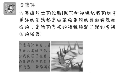 四是倡议“文明祭扫 绿色祭奠”。通过倡议活动将文明祭祀行为向家长和社会宣传,提高了广大师生的森林防火安全意识和疫情防控意识;同时教育了学生率先垂范,在清明节期间开展文明祭祀,家庭追思会,网络祭扫等文明低碳的现代祭扫方式。有的同学还用纸张折成千纸鹤,写下了寄语,寄托哀思,有的同学撰写了缅怀英烈的文章,用以表达对抗击新冠病毒的英灵们的敬仰之心。许多班级通过网络,共同观看全国性哀悼活动,并向英烈和逝世同胞默哀。通过缅怀英烈,追忆英雄,让同学们明白了“幸福”的来之不易,是英烈们用鲜血和生命换来的,进一步深化爱国教育。