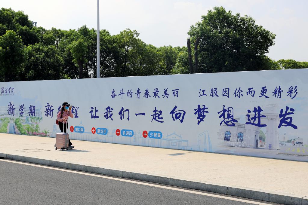 “新学期,新征程,让我们一起向梦想进发”的大型喷绘,“欢迎回家”的条幅,播放防疫宣传标语的电子显示屏,不同颜色的行进路线和指引标识……整个校园处处显示出欢迎学子返校的温馨氛围,以及在防疫方面所做的种种精心准备。