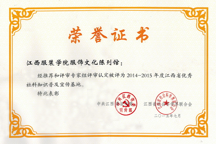 江西服装学院一贯秉持科研服务社会、文化引领社会的理念,践行大学文化传承创新的使命,鼓励支持人文社会科学教师从事文化普及工作,服饰文化陈列馆“全国优秀社会科学普及教育基地”荣誉称号的获得表明江西服装学院多年来科研与文化育人、文化服务社会取得了一定的成绩,得到了广泛的认可。此前江西服装学院还荣获由江西省委宣传部和江西省社会科学界联合会联合评选认定的“江西省优秀社科知识普及宣传基地”。