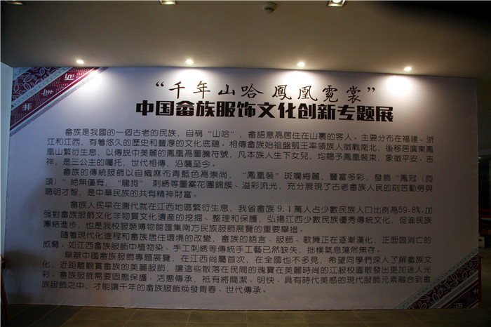 举办江西畲族服饰文化社科普及宣传展览,逐步建立完善江西畲族服饰展厅,是江西服装学院为深入学习贯彻党的十九大精神,高举新时代中国特色社会主义伟大旗帜,立足江西服务江西,坚定中国文化自信的新举措、新进展;是保护和弘扬畲族少数民族服饰文化事业的需要,将有效填补江西和全国畲族服装专业博物馆的空白;也将为江西服装学院以文化人、以文育人,增进各民族师生相互了解,促进民族团结进步,推动民族服饰社科普及教育再增添新的亮点,激励青年学子为建设美丽中国,实现中华民族伟大复兴的中国梦不懈奋斗。