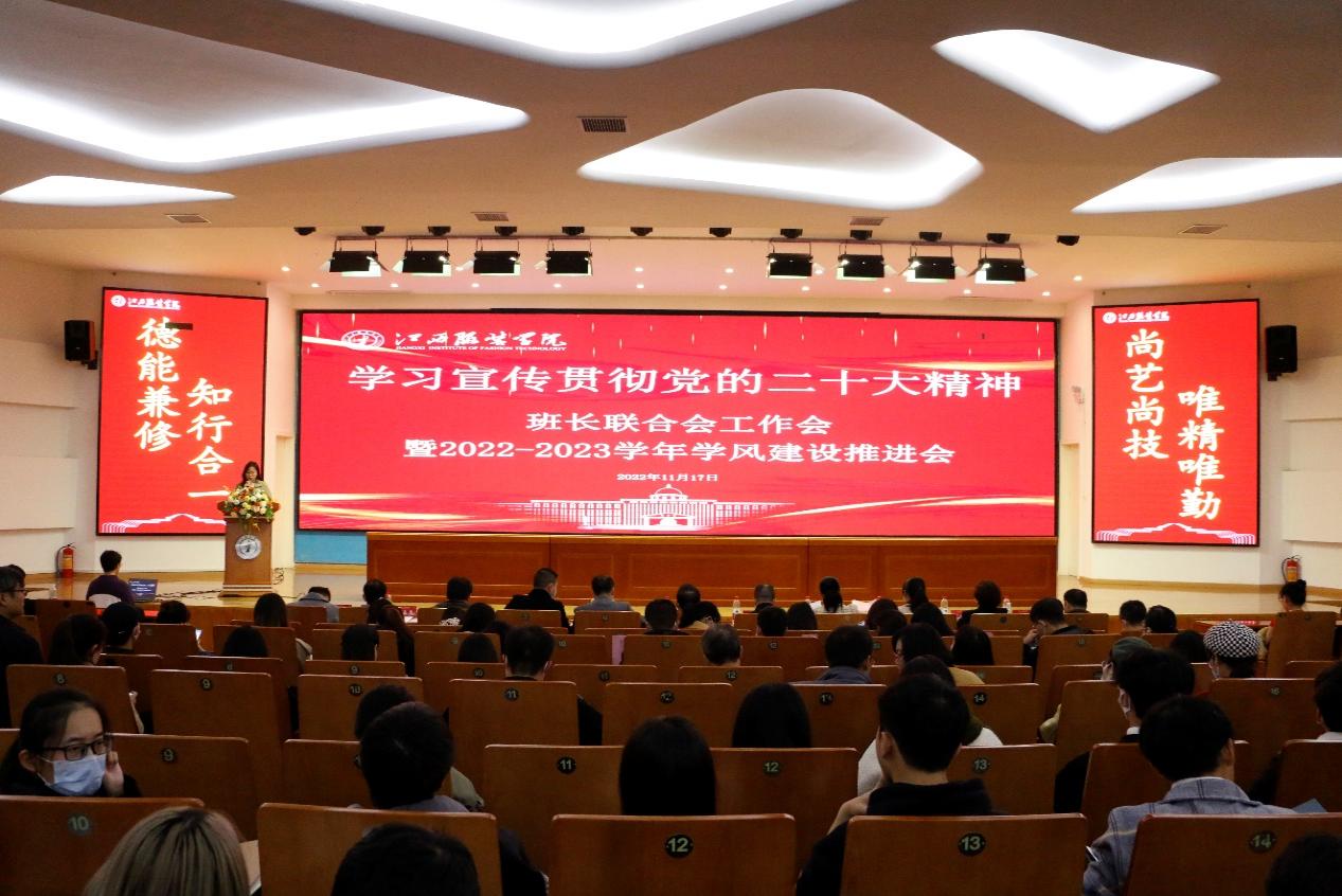 会议在慷慨激昂的国歌声中拉开序幕。会上,服装设计学院党总支书记蓝岚宣读了《关于表彰2022年上半年“班长讲主题班会课”获奖师生的决定》,大数据学院党总之书记王春梅宣读了《江西服装学院班长联合会建设实施方案》,商学院党总之书记黄晶磊宣读了《第一届班长联合会成员的任职通知》,学工处处长邓良峰部署了学风建设工作。