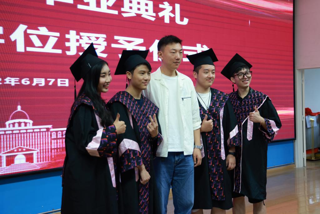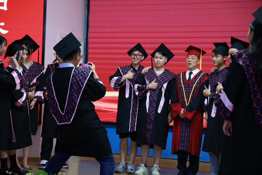 在教师、家长、校友的共同见证下,校领导薛家宝、徐炜、陈东生、唐新强、李宝君、马国照等为毕业生代表一一扶正流苏、颁授学位证书,并合影留念。