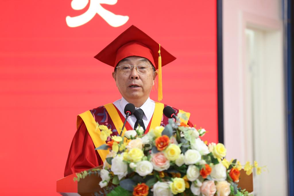毕业典礼在雄壮激昂的国歌声中拉开帷幕。校长薛家宝在讲话中向毕业生们送上了最热烈的祝贺和最美好的祝福,深情回忆了过去几年来同学们在“勤信博雅”校训的熏陶下,与江服同行,与时代共进的难忘时光,为同学们的成长与收获感到骄傲,并向即将作别菁菁校园的毕业生们深情寄语:一是希望同学们将家国情怀融入毕生,做勇担时代重任的接班人。希望同学们牢记总书记的殷切嘱托,将江服人爱国报国的传统镌刻在灵魂深处,以爱国之心打造生命的底色,以家国情怀托举时代使命,以青春之才智创强国伟业,奋勇搏击、砥砺前行,在祖国的万里长空放飞青春梦想,争做新时代堪当大任的中国青年。二是希望同学们将求真力行融入毕生,做掌握硬核本领的实干家。希望同学们始终秉承母校“勤信博雅”的校训,刻苦学习、认真实践,始终把学习作为精神追求和生活方式,锤炼奋勇争先的意志品格,培养百折不挠的进取精神,严谨务实、苦干实干,求真学问、练真本领,让勤奋学习成为青春远航的不竭动力,让增长本领成为青春搏击的巨大能量,自强不息,成就自己的精彩人生。三是希望同学们将从善求美融入毕生,做美好幸福生活的奋斗者。希望同学们始终保持积极的人生态度,充满信心、坚定笃行,正确对待一时的成败与得失,处优而不养尊,受挫而志愈坚,依靠勤劳和汗水开创美好人生。要牢记“从善如登,从恶如崩”的道理,时常用真善美雕琢自己,不断培养高洁操行和纯朴情感,主动承担社会责任,做一个做事有规矩、做人有情义、生活有滋味的快乐奋斗者。四是希望同学们将孜孜求索融入毕生,做勇攀高峰路上的创新者。希望同学们树立“衣带渐宽终不悔”的决心,鼓起“不破楼兰终不还”的勇气,孜孜求索、不断创新。积小胜为大胜、积跬步至千里。自信、踏实、从容地走好每一步,去实现自己的人生梦想,开创属于自己的美好未来!
