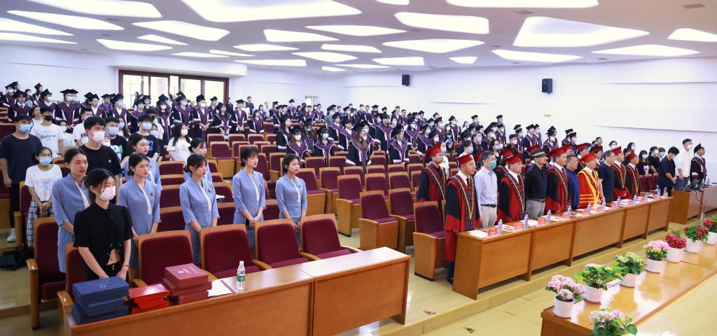 薄云晴日,晨光万缕,花开盛夏,骊歌浅唱。6月7日上午,思贤楼报告厅气氛既庄重又热烈,江西服装学院2022届毕业生毕业典礼暨学位授予仪式在此隆重举行。学校理事长涂顺强、校长薛家宝和学位评定委员会全体成员出席典礼,相关职能部门负责人和各二级学院党总支书记、院长、毕业班辅导员、教师代表及毕业生代表参加典礼。1万余名学生、毕业生家长、校友通过现场直播参加了“云毕业典礼”。常务副校长徐炜主持典礼。