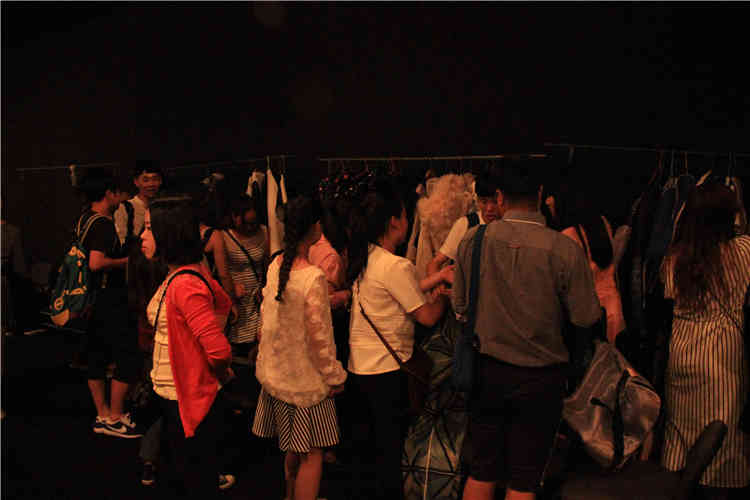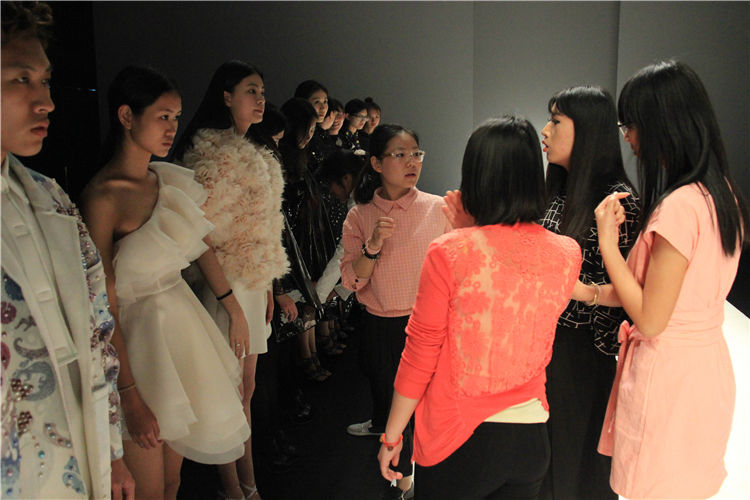 来到后台,设计师们正在对自己的作品进行最后的调整,不断完善着细节,力争使自己的作品精益求精。模特们也在紧张排练,力求与音乐、服装作品达到最大的默契度。