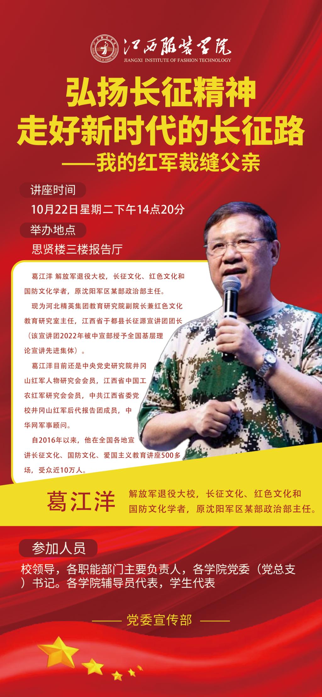 为铭记红军丰功伟绩,弘扬伟大长征精神,进一步做好师生思想教育工作,引导全校师生不忘初心、继续前进,走好新时代的长征路,10月22日下午,学校邀请到1934年随中央红军开始长征,时任缝纫班班长,背着德国飞人牌手摇缝纫机走完了二万五千里长征路,并在陕北为毛主席做了一套棉衣的老红军葛接调的后代,解放军退役大校,于都长征源宣讲团团长葛江洋来校,为师生带来了一场题为《弘扬长征精神,走好新时代的长征路——我的红军裁缝父亲》的主题报告会。校党委副书记唐新强,相关职能部门负责人,各学院党委(总支)书记以及辅导员和学生代表近500人聆听了报告会。党委委员、宣传部部长沈新建主持报告会。