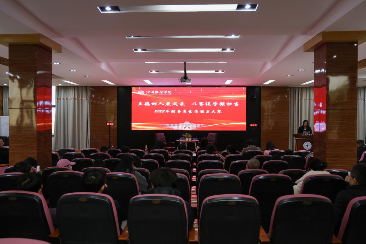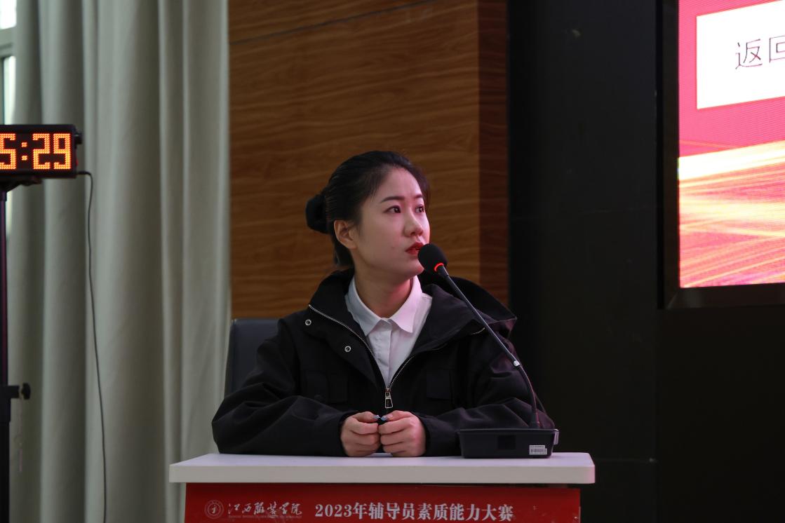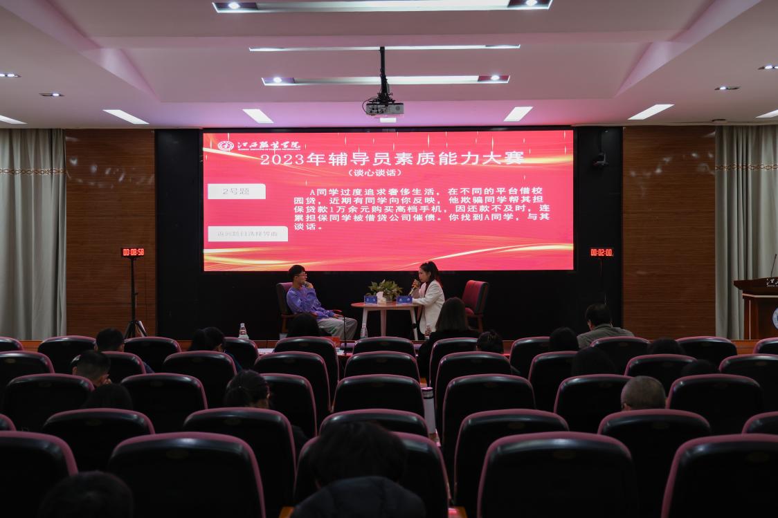 新闻中心讯(学工处供稿 摄影/钟涛 实习记者 陈谢晓庆) 为提升我校辅导员的理论水平、职业能力和专业素养,通过以赛促学、以赛促建,进一步推进我校辅导员队伍职业化、专业化、专家化发展,11月24日,我校举办2023年辅导员素质能力大赛初赛(基础知识测试),学校辅导员全员参与,通过“大练兵”全方位考核辅导员业务基本功,通过基础知识测试,共有12位选手进入决赛环节。25日,决赛(案例研讨、谈心谈话)在行政楼一楼报告厅顺利举行。第八届全国高校辅导员素质能力大赛一等奖、江西省高校辅导员素质能力大赛一等奖、江西省“十大最美辅导员”胡园慧;全国高校辅导员年度人物提名、江西省青年五四奖章获得者,江西省高校辅导员名师工作室主持人付妍妍担任评委。党委学生工作部部长邓良峰,各学院党委(总支)书记(副),全体辅导员及部分学生代表全程观摩比赛。决赛由艺术设计学院辅导员游丽君主持。