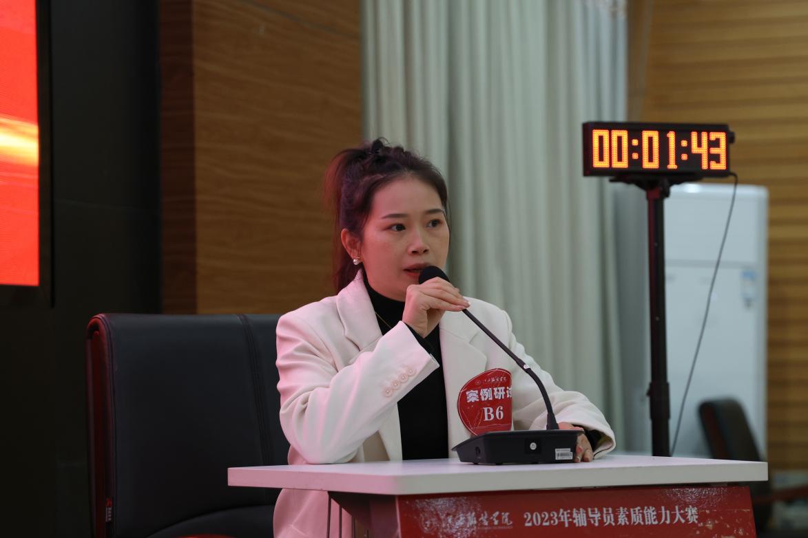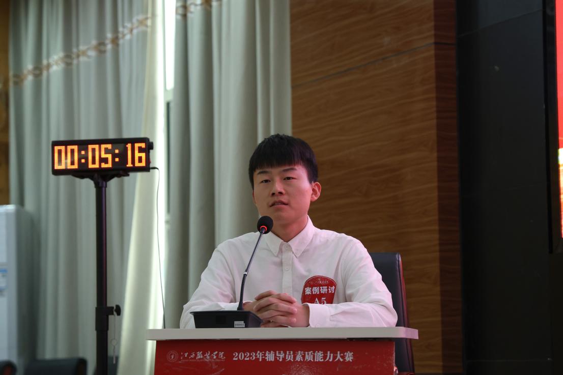 案例研讨,主要考察辅导员综合运用理论分析问题、研判问题、解决问题、应急处突等能力。选手在赛前抽取AB角签位,赛前10分钟分别抽取1道案例。比赛以“我提问,你回答”的方式开展,由AB选手围绕案例共同辨析原因、研讨对策、总结规律。6组选手既是对手、又是辩手,围绕“就业创业”“理想信念”“党员发展”“网络舆情”“心理危机”“宗教信仰” 等主题,选手们以饱满的精神状态和流畅的语言表达,在案例研讨环节剖析问题本质,探求解决思路,提出实施办法,彰显育人理念,充分展示了我校辅导员扎实的职业功底。