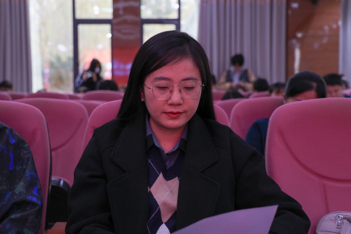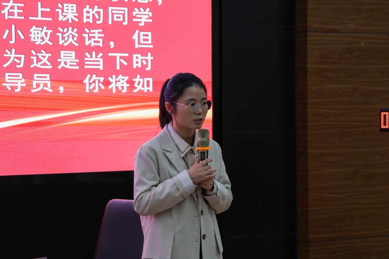谈心谈话,主要考察辅导员对学生特征、学生成长成才规律的了解把握程度,对学生的教育引导能力、解决理论困惑和实际问题的能力等。参赛选手提前10分钟抽题,按照“人题匹配”的原则与学生开展谈心谈话。12位选手分别围绕情感困惑、学业压力、电信诈骗、党员发展、宿舍人际关系等话题与学生开展谈话,老师们充分运用心理学、教育学、职业发展教育等专业知识及自身工作经验进行价值引领,充分展示了辅导员扎实的政策把握能力、全面的信息分析能力与过硬的教育引导能力。比赛现场学生化身“戏精演员”,学生与老师金句频出,不时引出阵阵笑声,为比赛增添了欢乐性和趣味性。