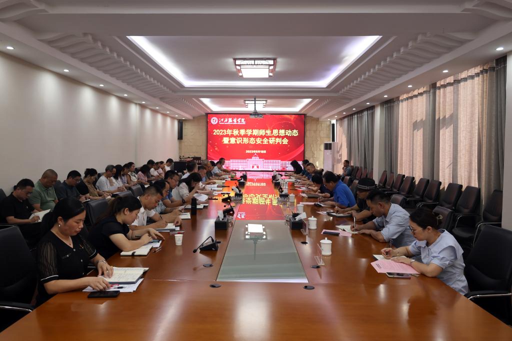 新闻中心讯(图/文 万强) 9月18日,学校召开2023年秋季学期师生思想动态暨意识形态安全研判会,深入学习贯彻落实省委教育工委、省教育厅关于意识形态和校园安全稳定工作的有关精神,了解师生新学期思想动态,进一步加强和改进学校意识形态和安全稳定工作。校党委书记陈付龙、校长薛家宝及在家校领导出席会议,各学院(部)党政负责人、各部门主要负责人参加会议。校长助理闵悦主持会议。