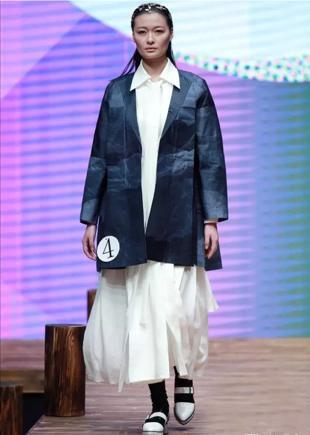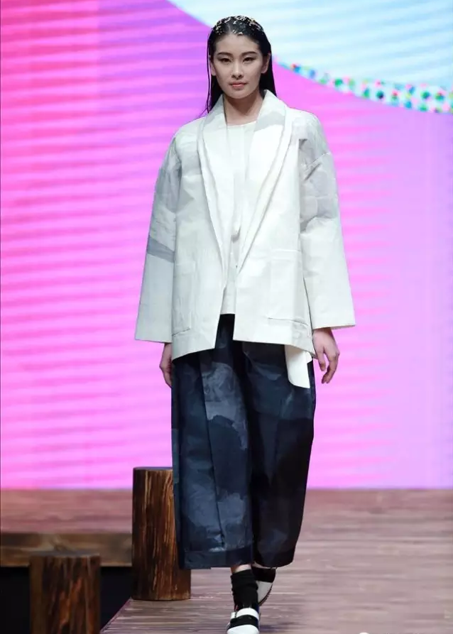 付志臣的作品《纯形态的境界》,色彩清淡,设计简单实用。而且他很取巧的将局部放大,比如领子,袖子,脚口等。制造一种蓬松感,自由感。通过服装多层次搭配,有轻有重的配色方案,一下就获得评委们的青睐。
