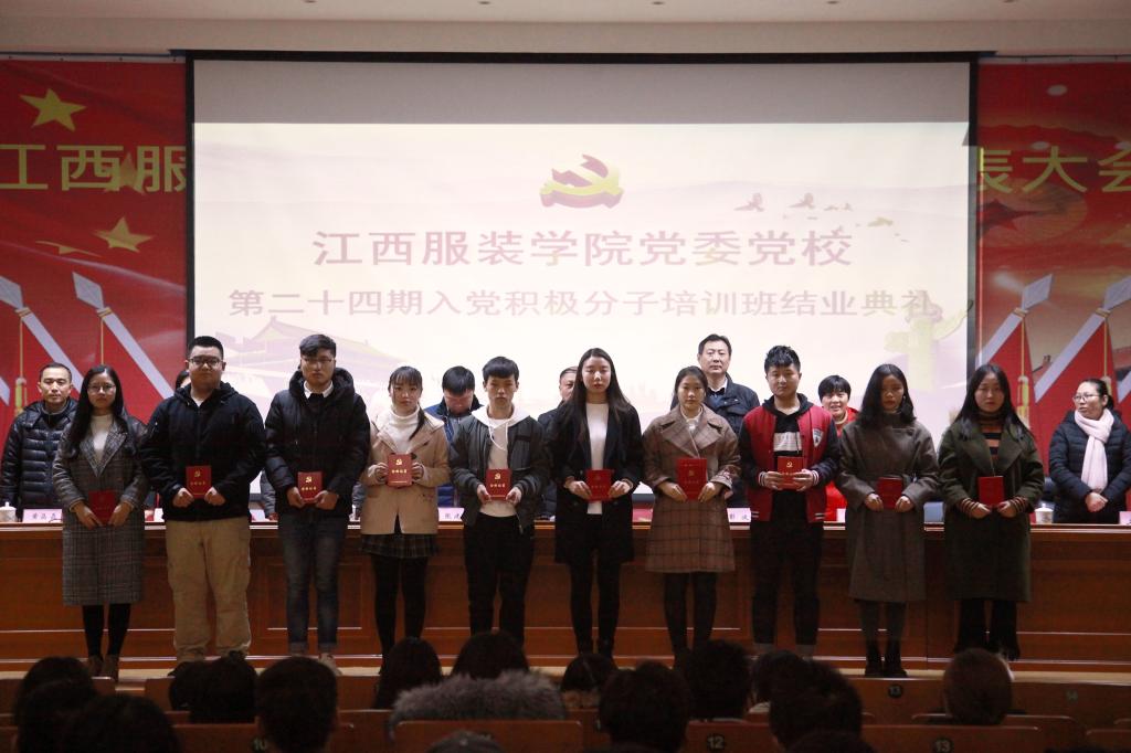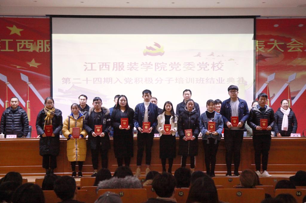 服装报讯(记者/黄海蓉 实习记者/刘莹莹 摄影/张蔷薇 林立锋 刘贡献) 12月28日晚,校党委党校举行了第二十四期入党积极分子培训班结业典礼。校党委副书记、党校校长高建国,党委委员、党委组织部部长陈翠娥,党委委员、学工部部长张建荣及校团委书记、各学院党总支书记出席典礼,各学院学生党支部书记、组织委员及全体培训学员参加了典礼。典礼由党委委员、党委宣传部部长彭波主持。