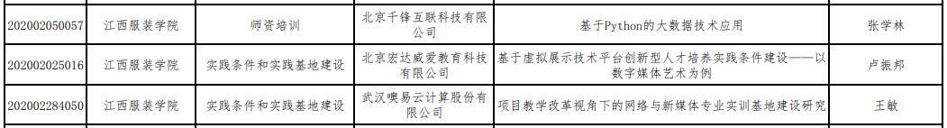 新闻中心讯(万强) 近日,教育部下发《教育部高等教育司关于公布2020年产学合作协同育人项目立项名单的通知》(教高司函〔2021〕3号),公布了2020年第一批产学合作协同育人立项项目名单,我校“基于Python的大数据技术应用”“基于虚拟展示技术平台创新型人才培养实践条件建设——以数字媒体艺术为例”“项目教学改革视角下的网络与新媒体专业实训基地建设研究”3个项目成功获批立项。
