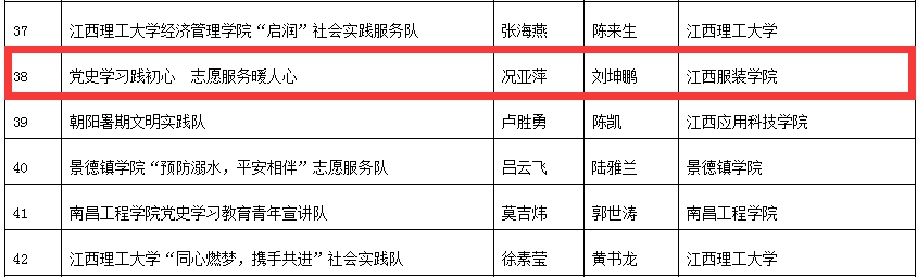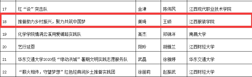 (新闻中心讯)近日,江西省教育厅、省文明办发布《关于公布2021年全省高校大学生暑期文明实践志愿行动评选结果的通知》,我校三支队伍“推普助力乡村振兴,聚力共筑中国梦”、“党史学习践初心志愿服务暖人心”、“‘讲述百年党史,筑梦青春之旅’志愿服务队”获评“优秀志愿服务团队”荣誉称号,龚琦、况亚萍、龙瑞行三位教师获评优秀指导教师荣誉称号。