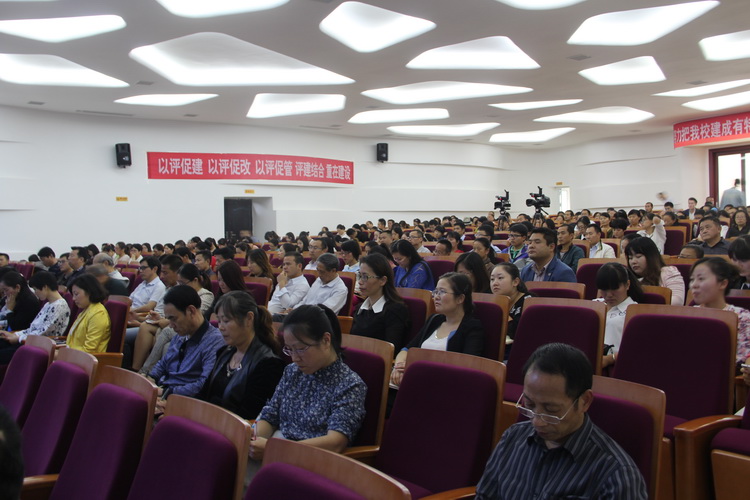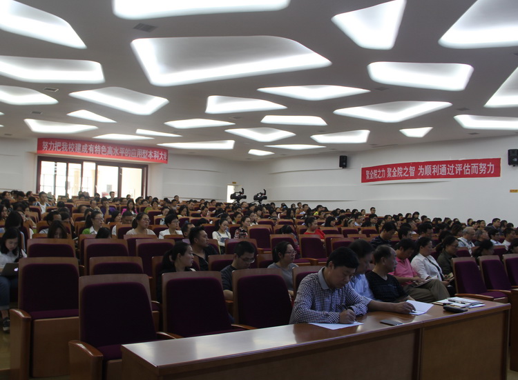 服装报讯(莫言 摄影/万强 朱雨春) 根据《教育部办公厅关于开展普通高等学校本科教学工作合格评估的通知》精神,2017年底我校将接受教育部专家组对我校进行“本科教学工作合格评估”。为了提前部署,以评促建,做好迎评准备工作,10月13日下午,学校在思贤楼报告厅召开了迎接教育部本科教学工作合格评估动员及工作部署会,校长陈万龙作了重要讲话。会议号召全体教职工正确领会评估工作的意义和内涵,以积极的姿态投入到学校的迎评促建工作中去。学校及各分院各部门领导、全校科级以上人员、教师和班主任参加了会议。