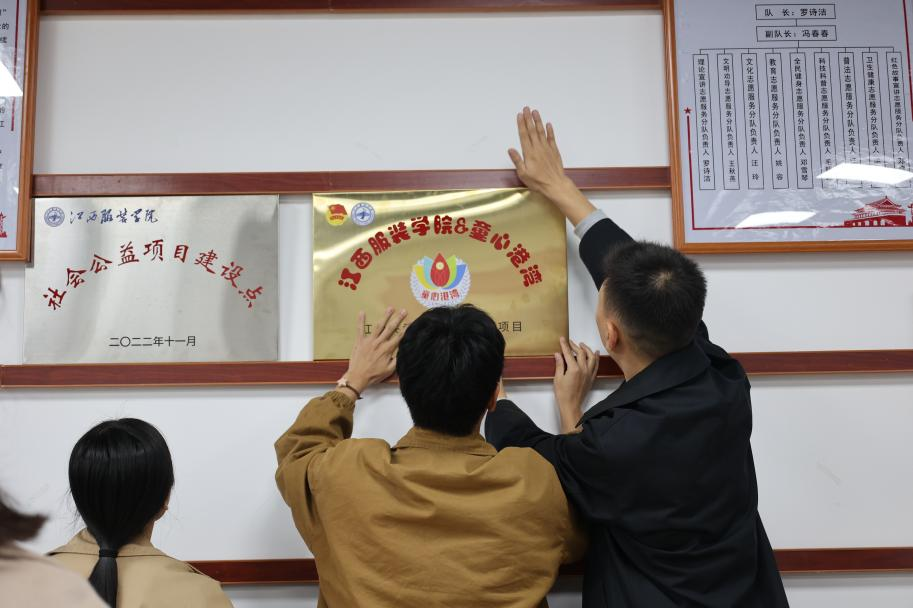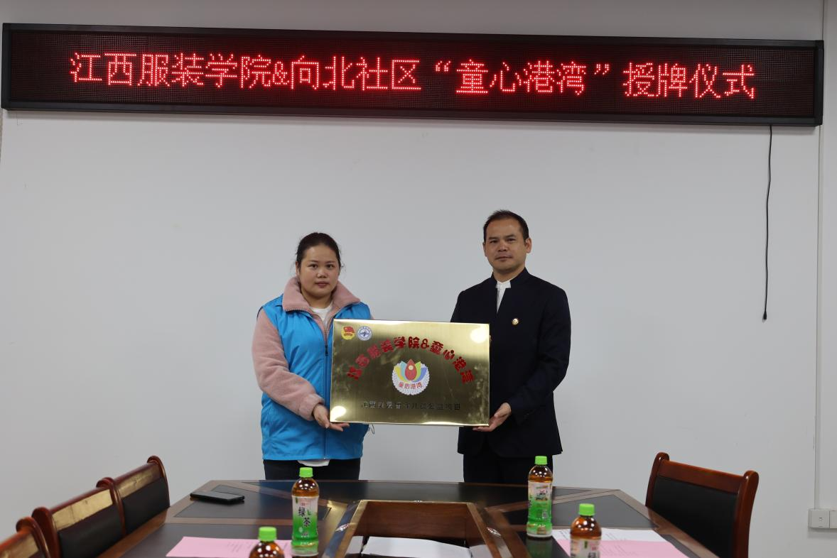 11月15日上午,江西服装学院党委副书记唐新强与校团委书记孟安然一行前往向塘镇向北社区新时代文明实践中心举行“童心港湾”和社会公益项目建设点授牌仪式。向塘镇党委副书记邓莉、向塘镇团委书记刘美婷、向北社区党委书记罗诗洁及社区“童伴妈妈”冯春春等出席,我校团委社会实践部张震老师主持此次仪式。