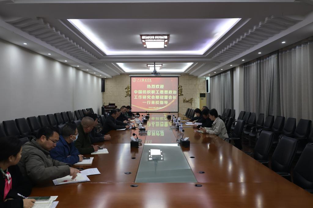 新闻中心讯 3月1日上午,中国纺织职工思想政治工作研究会会长邢冠蕾、秘书长郑国峰,江西省工信厅纺织处处长熊善平、副处长赵宋婷一行4人来校调研指导工作。学校在行政楼二楼会议室召开座谈会,校党委书记陈付龙主持会议,党委副书记、纪委书记李宝君,党委副书记唐新强出席座谈会,相关职能部门负责人参加了座谈会。